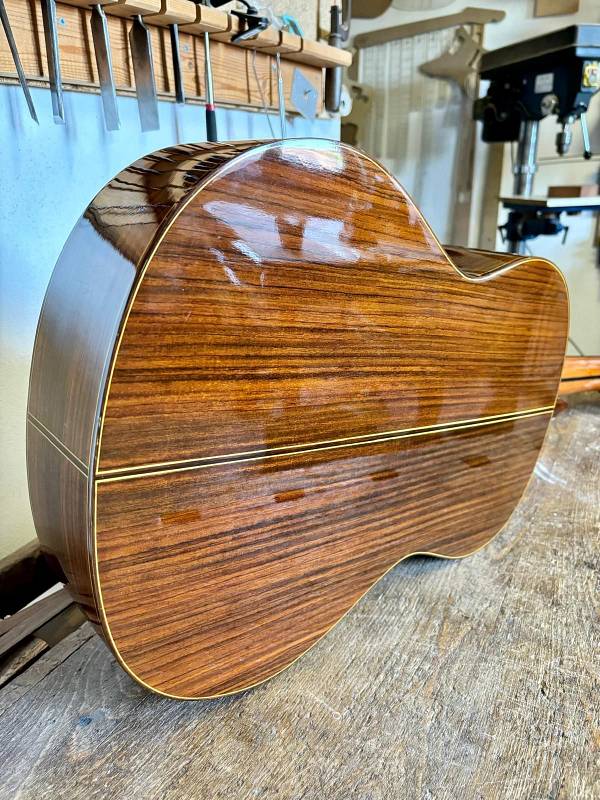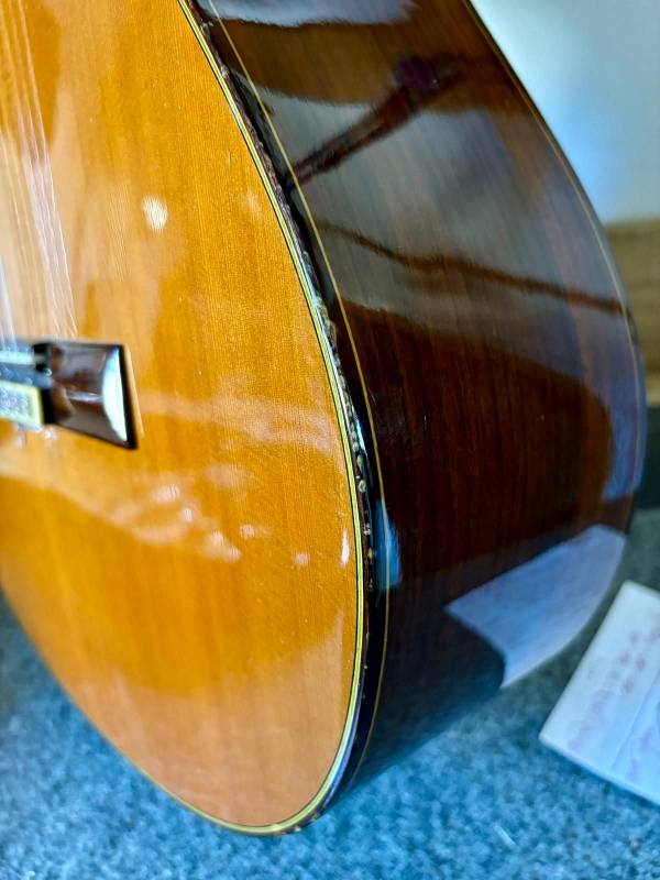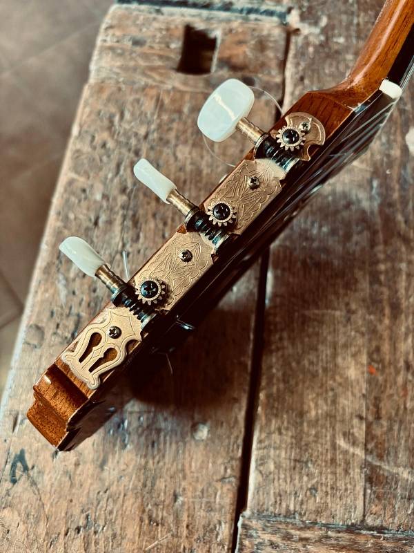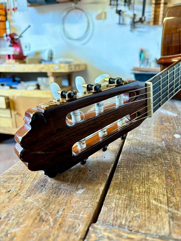 Chitarra di liuteria spagnola, con fondo e fasce in palissandro massello, tavola armonica in cedro massello, manico in cedrella e tastiera in ebano.