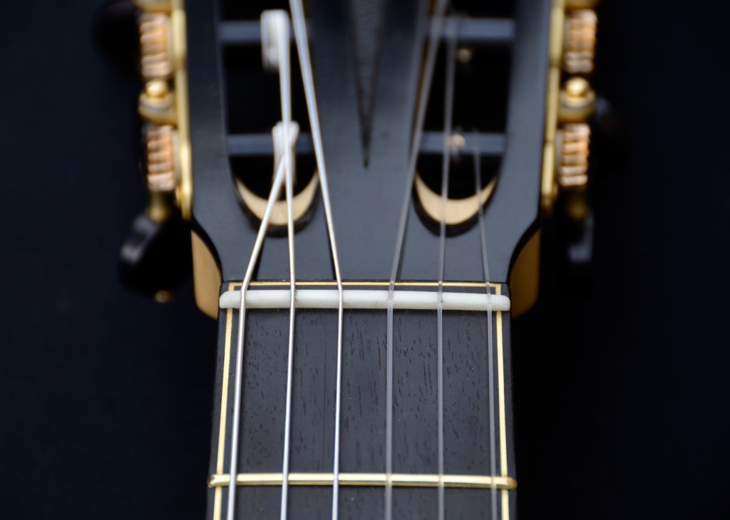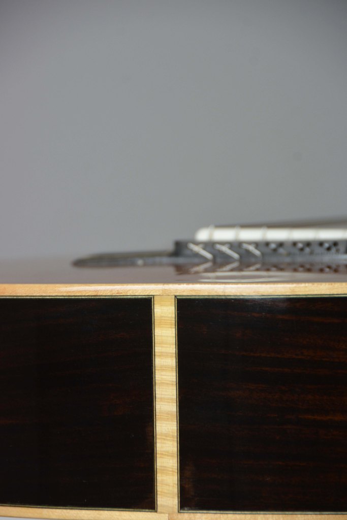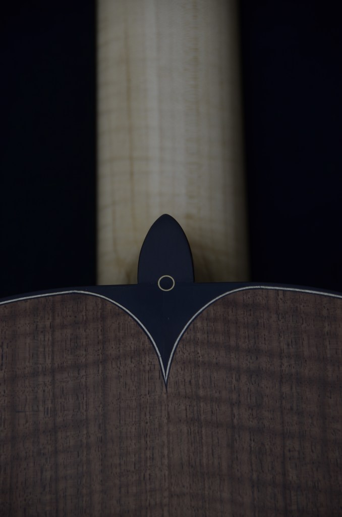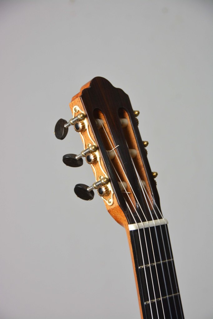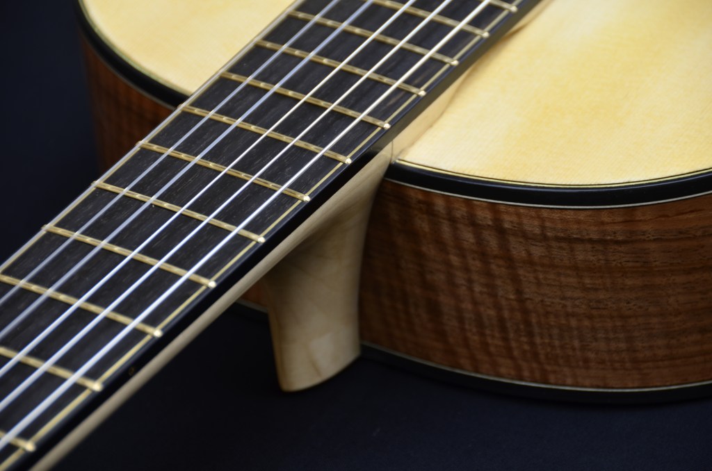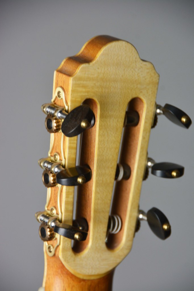 Il manico è sempre in cedrella o mogano, con tastiera in ebano, il tutto equipaggiato con meccaniche di qualità come Alessi e finito a mano con vernici naturali a base di gommalacca.
